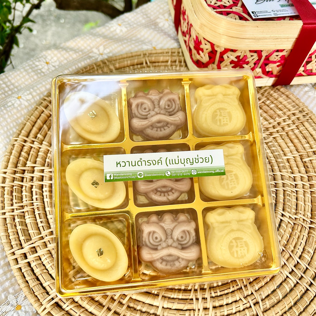 ถั่วกวนและเผือกกวนเนื้อเนียน หอมหวานกำลังดี จัดเป็นชิ้นพอเหมาะ มาในรูปแบบของมงคลความหมายดี ทั้งก้อนทองคำ, สิงโต และถุงเงินนำโชคค่ะ